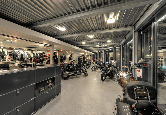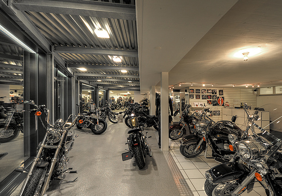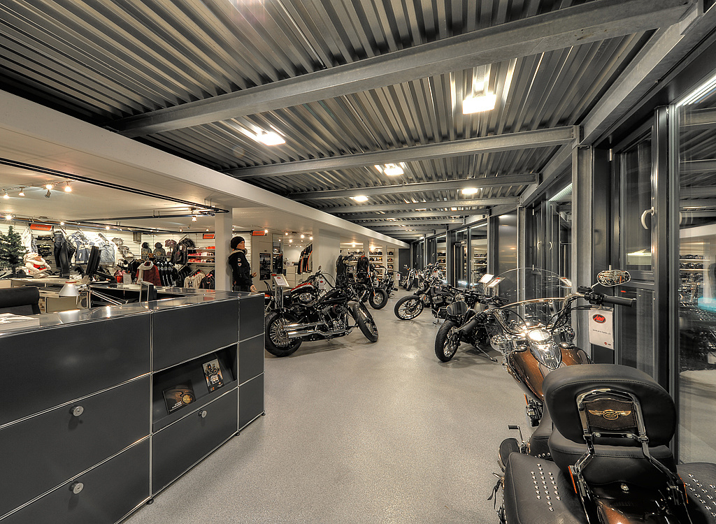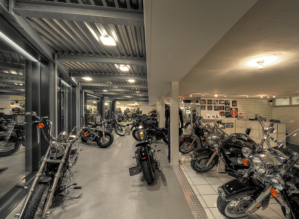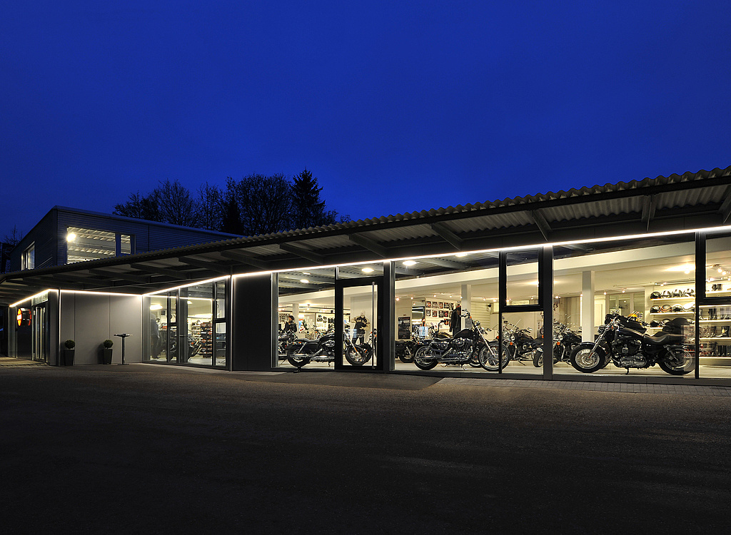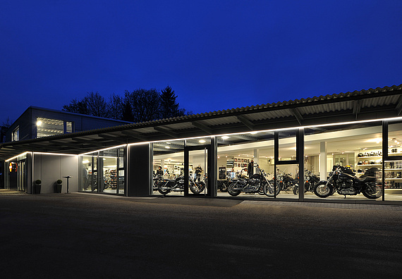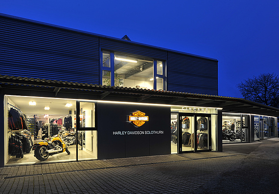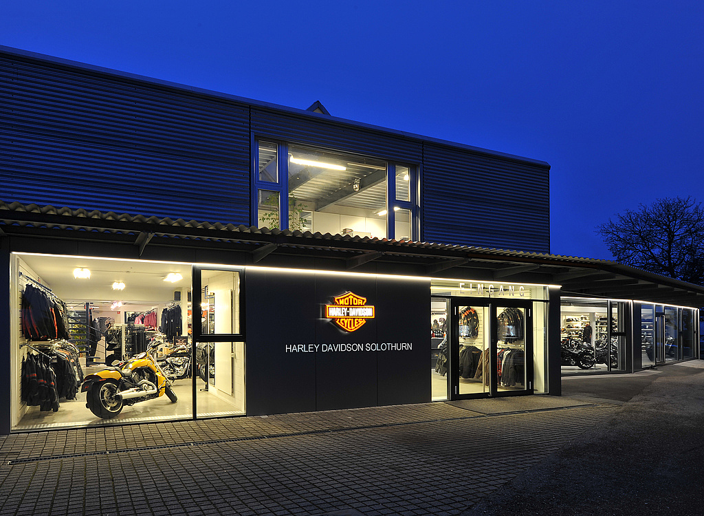 Der Um- und Anbau des Ausstellungsraumes von Harley Davidson ® Solothurn wurde in Form einer zeitlosen Fassade aus Alucobond und grossformatigen, fassadenbündigen Fenstern umgesetzt. Die gewonnene Transparenz schafft die gewünschte Nähe der Kundschaft zu den Ausstellungsmodellen.