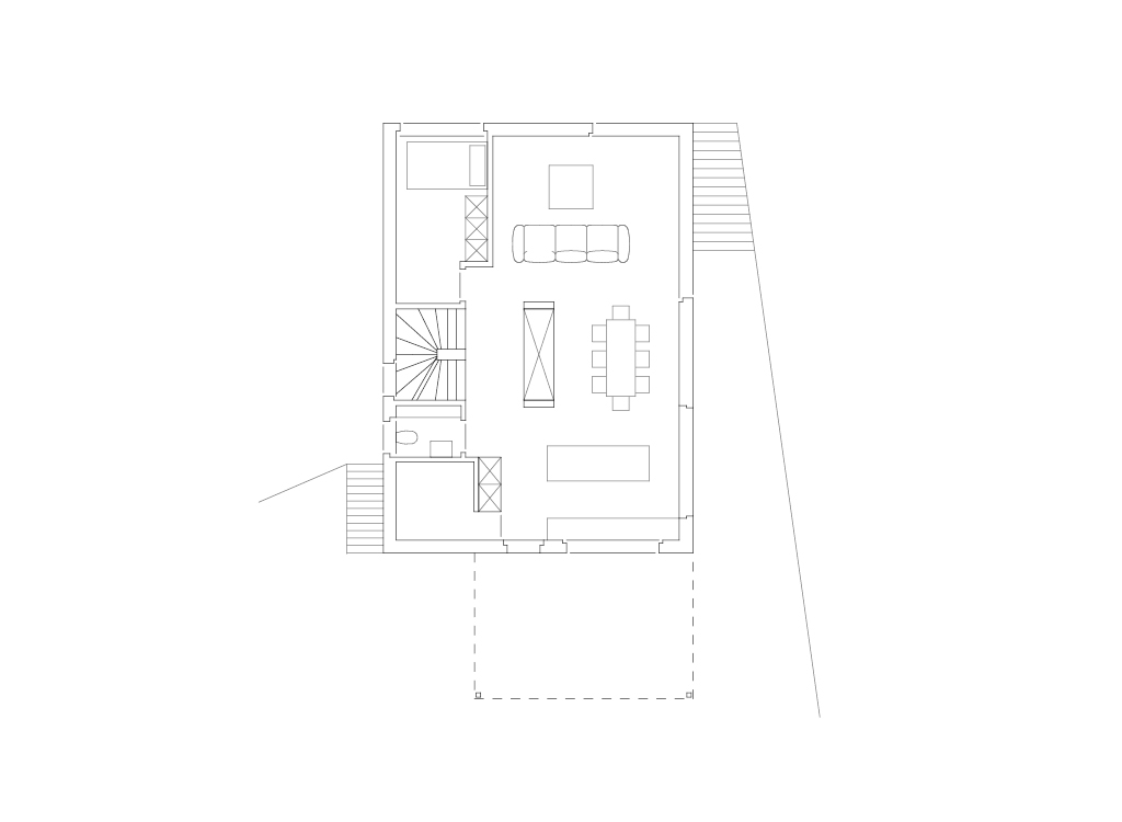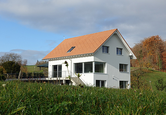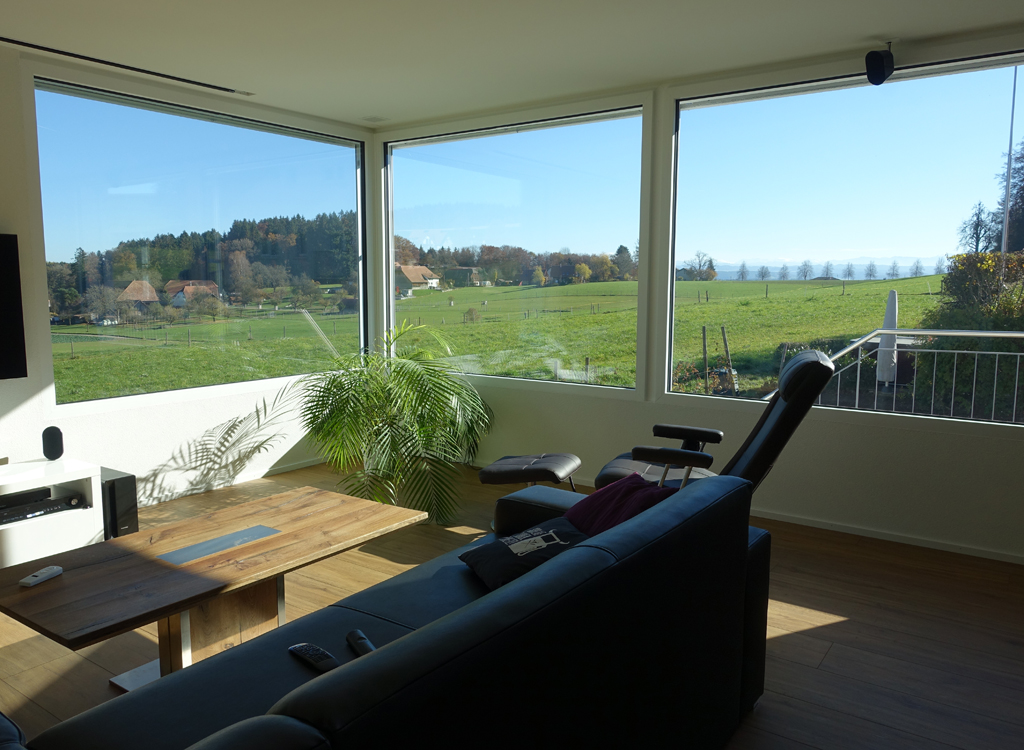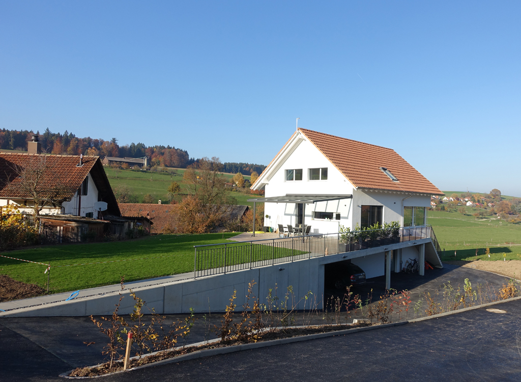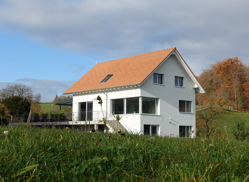 Die Platzierung des Gebäudes und die Ausrichtung der Räume ist dem Ort angepasst: Die Erschliessung des Gebäudes erfolgt im Sockelgeschoss. Der Wohnbereich richtet sich mit gezielten Ausblicken gegen die Berner Alpen, wobei der offene Wohnraum mit Essen und Kochen auf den Sitzplatz erweitert wird.